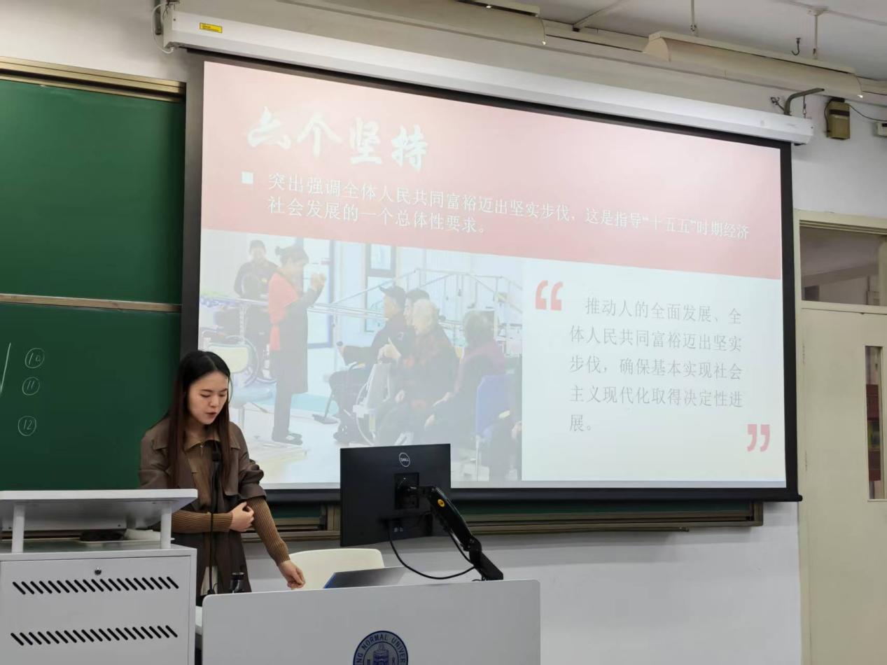 宣讲会由《“数”读党的二十届四中全会精神》和《中国人的长期主义——从“一五”计划到“十五五”规划》两个紧密衔接的专题报告组成。马克思主义学院2025级硕士研究生、宣讲团讲师刘丁首先登台主讲。她以清晰的逻辑和翔实的数据,系统梳理了党的二十届四中全会的核心要义,重点从“一个关键时期”“三个判断”“六个坚持”等方面,对“十五五”规划建议的总体要求、战略任务和重大举措进行了深入浅出的解读,为同学们准确把握新征程上的行动纲领提供了精准指导。