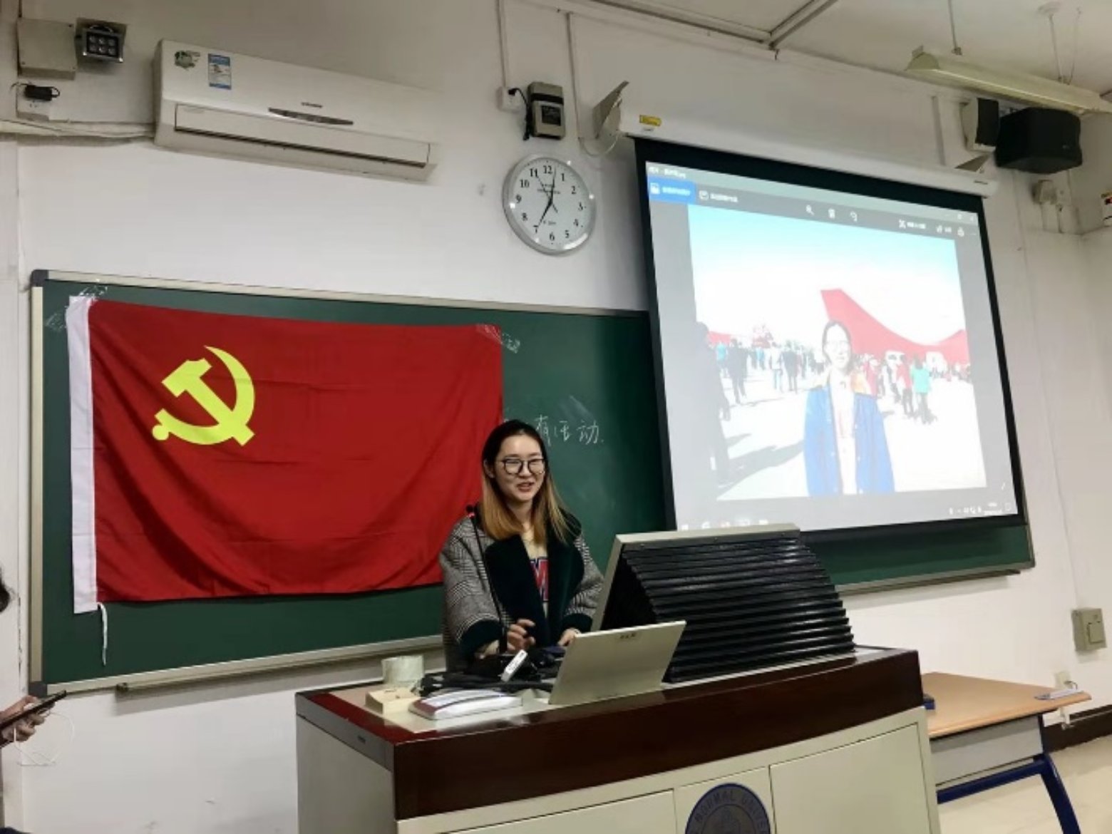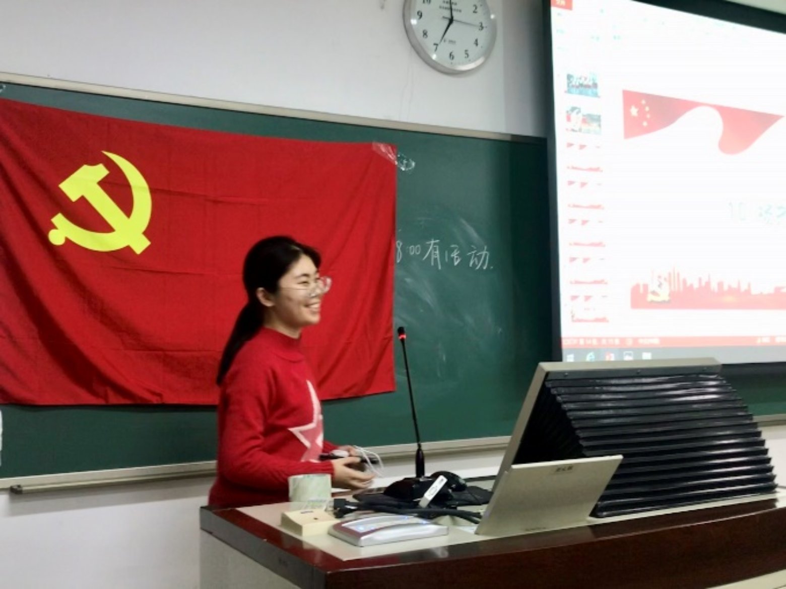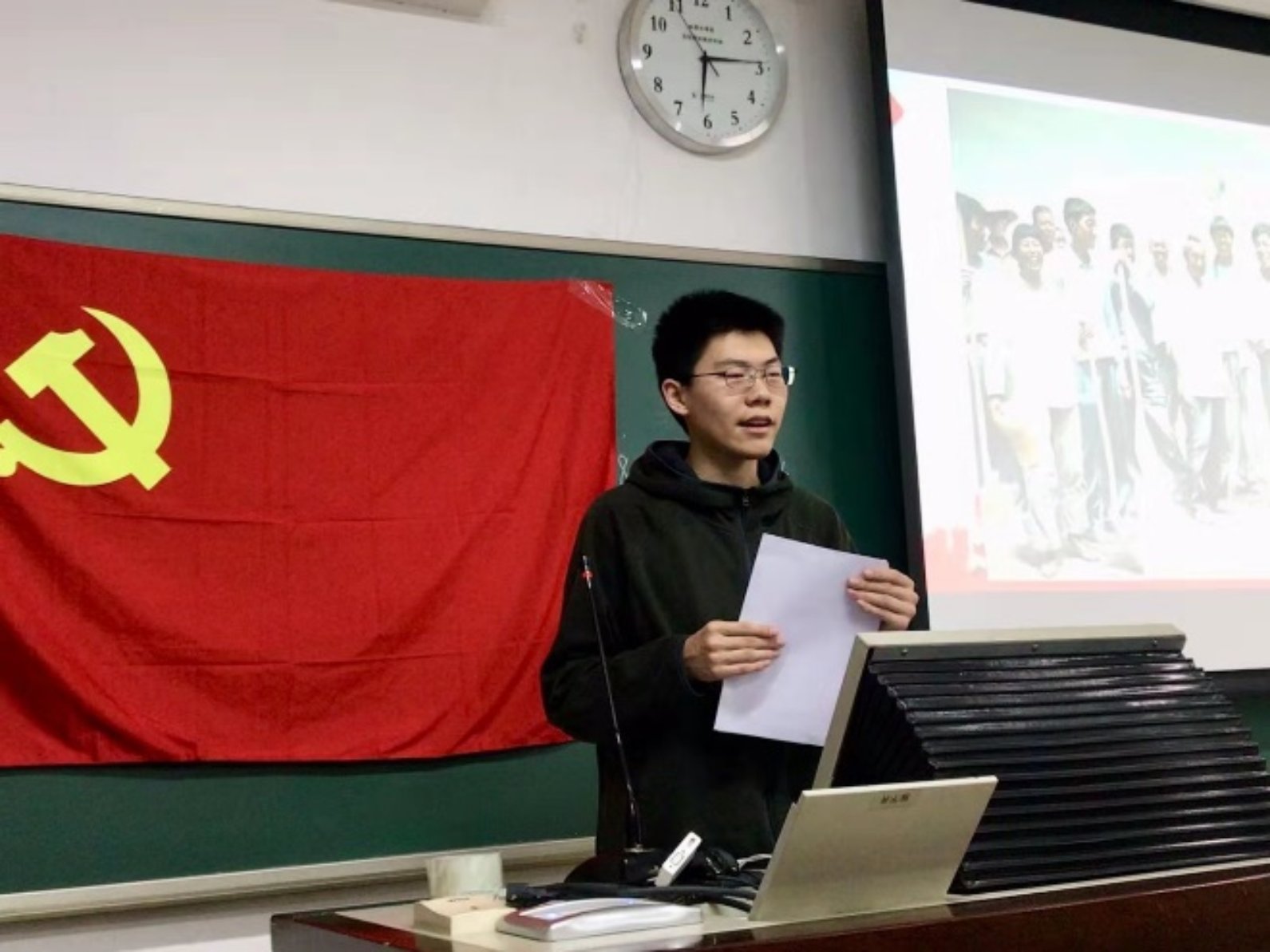 第二位讲述者是王奕琛,他为同学们讲述了安徽省凤阳县小岗村党委第一书记沈浩的感人事迹。作为最基层的干部,沈浩心系百姓,鞠躬尽瘁、尽心尽力,被当地百姓不断要求连任,却最终牺牲在工作岗位上。像沈浩一样的基层党员干部在中国还有千千万,正是他们的不断努力付出,才有了如今七十周年的繁华盛景。