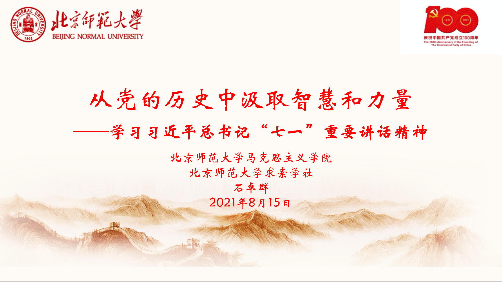 为深入学习贯彻习近平总书记“七一”讲话精神,2021年8月15日,欧洲杯 欧洲杯 2020级法律硕士第二党支部、统计学院2020级专硕党支部及珠海校区2020级硕博党支部共同举办了“从党的历史中汲取智慧和力量”——学习习近平总书记“七一”重要讲话精神主题分享会。