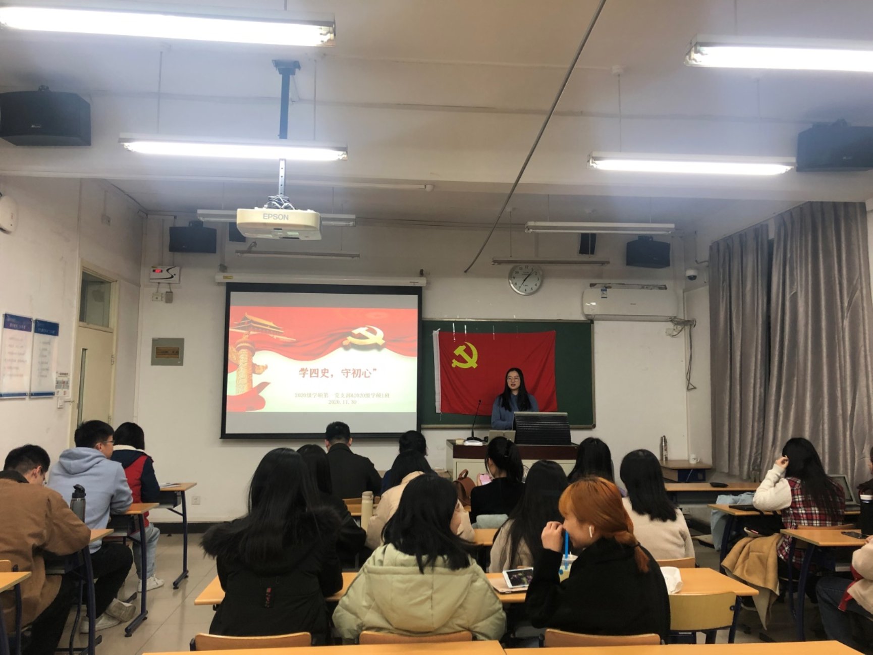 为贯彻落实学校党委关于深入开展党史、新中国史、改革开放史、社会主义发展史学习教育要求,弘扬爱国主义精神,2020年11月30日欧洲杯 2020级学硕第一党支部与2020级学硕一班联合举办“学四史、守初心”活动。本次会议共23人参加,其中正式党员应到16人,实到16人,入党积极分子和班级同学参加了此次活动,活动于教四117开展,由党支部书记林思丽进行主持。