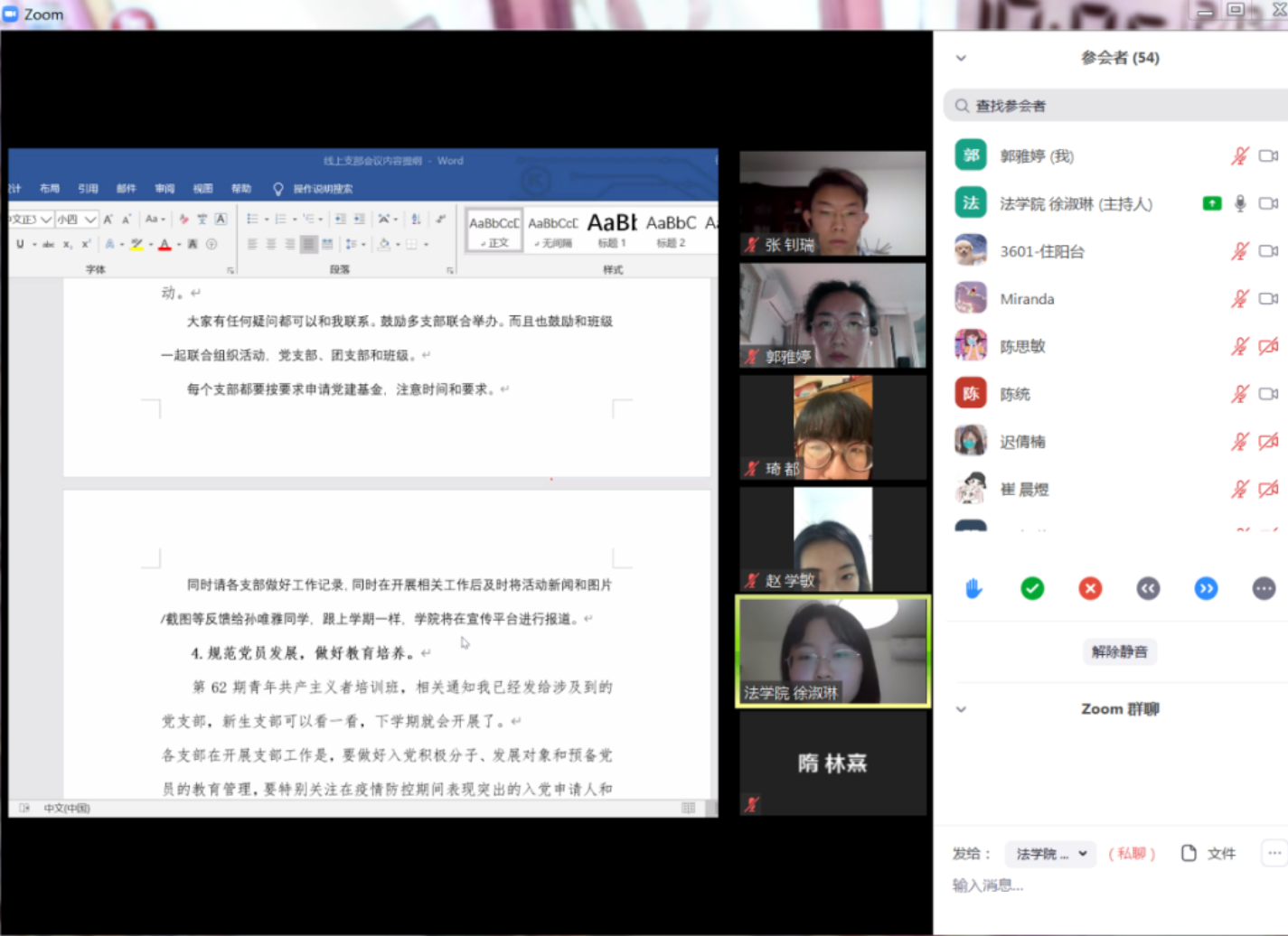 为深入贯彻习近平总书记坚决打赢疫情防控阻击战的重要指示精神,认真落实党中央、教育部及学校有关疫情防控工作部署,巩固深化“不忘初心、牢记使命”主题教育成果,带动广大学生党员统一思想、凝聚共识、鼓舞士气,做好疫情防控期间学生党建工作,开展好新学期学生党支部各项工作,欧洲杯 党委于2020年3月6日晚7点依托zoom平台召开新学期学生党支部线上工作会议。欧洲杯 党委副书记郭雅婷、专职辅导员徐淑琳、各学生党支部书记和其他支委以及学生党建组织员共54人参加了本次会议。