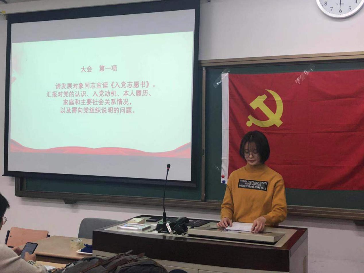 在第一个环节中,党支部严格按照程序召开关于讨论接收王华鹏、张诗语、张菲等7名同志为中共预备党员的会议。会议议程共七项,第一项议程:发展对象同志宣读《入党志愿书》,汇报对党的认识、入党动机、本人履历、家庭和主要社会关系情况,以及需向党组织说明的问题。第二项议程:入党介绍人、分别介绍发展对象有关情况,并对其能否入党表明意见。第三项议程:党支部书记/组织委员代表支部委员会报告对发展对象同志的审查情况。第四项议程:与会党员对发展对象能否入党进行充分讨论。第五项议程:与会正式党员进行无记名投票表决。第六项议程:宣读支部大会决议,并请与会党员提出修改意见。第七项议程:支委宣布表决结果。最后7名同志发表了自己成为预备党员的感想。