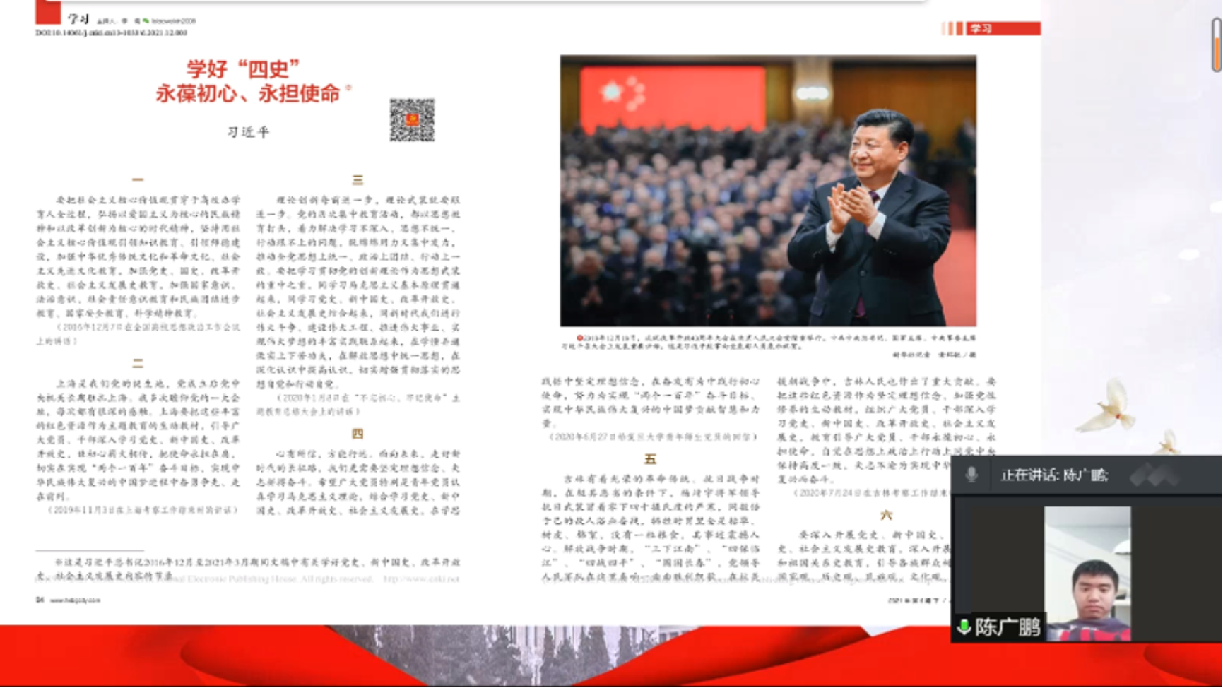 会议伊始,支部全体成员共同学习了习近平总书记《学好“四史”、永葆初心、永担使命》专题文章。支部书记詹周达同志强调在中国共产党建党百年的伟大历史时刻,我们应当坚持不忘初心、牢记使命,积极贯彻习总书记要求,通过阅读学习习总书记重要文章成果,认真学习党史、新中国史、改革开放史和社会主义发展史。支部同志们表示将在日常学习过程中,认真持续学好党史、“四史”知识,树立正确的历史观,自觉抵御历史虚无主义。