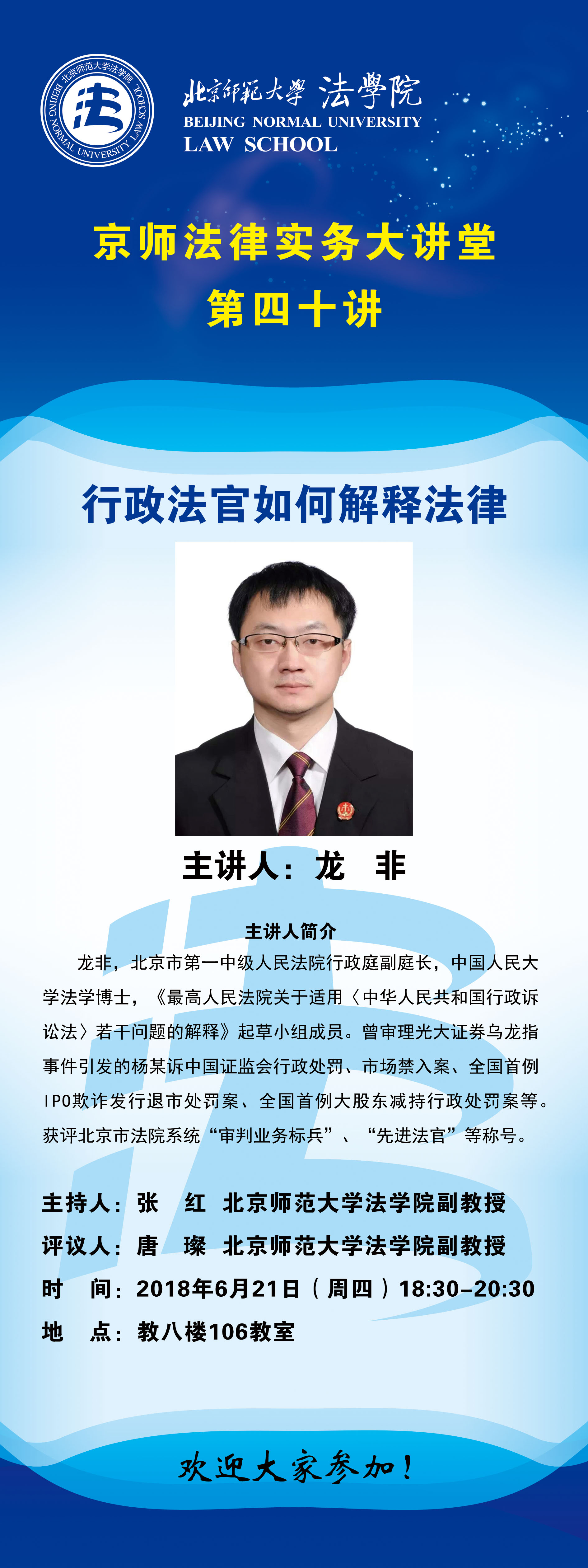 本次讲座特别邀请到北京市第一中级人民法院行政庭副庭长龙非法官担任主讲,讲座的主题是“行政法官如何解释法律”。