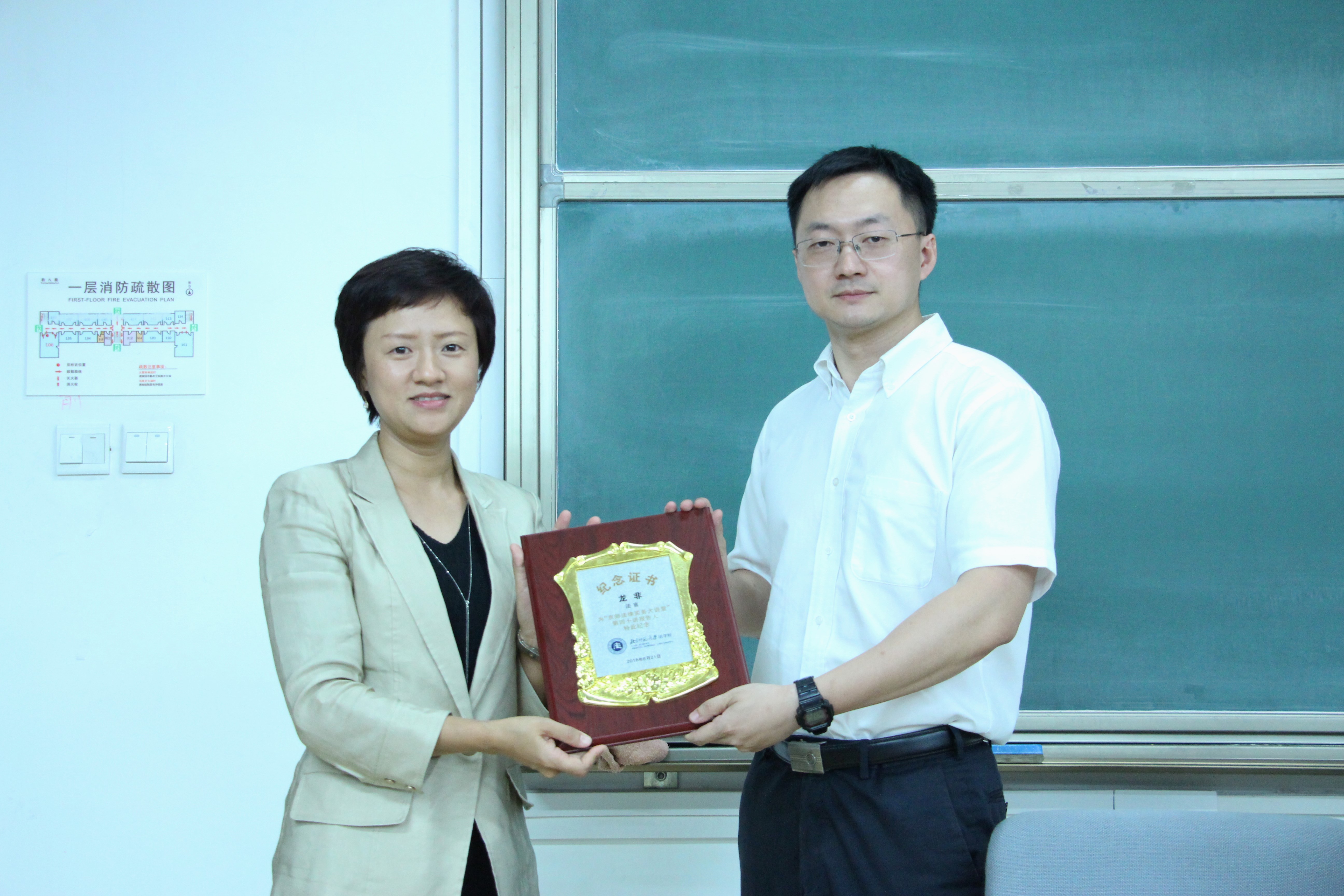 讲座结束前,按照惯例,欧洲杯 张红副教授向龙非法官赠送京师法律实务大讲堂纪念奖牌,并合影留念。