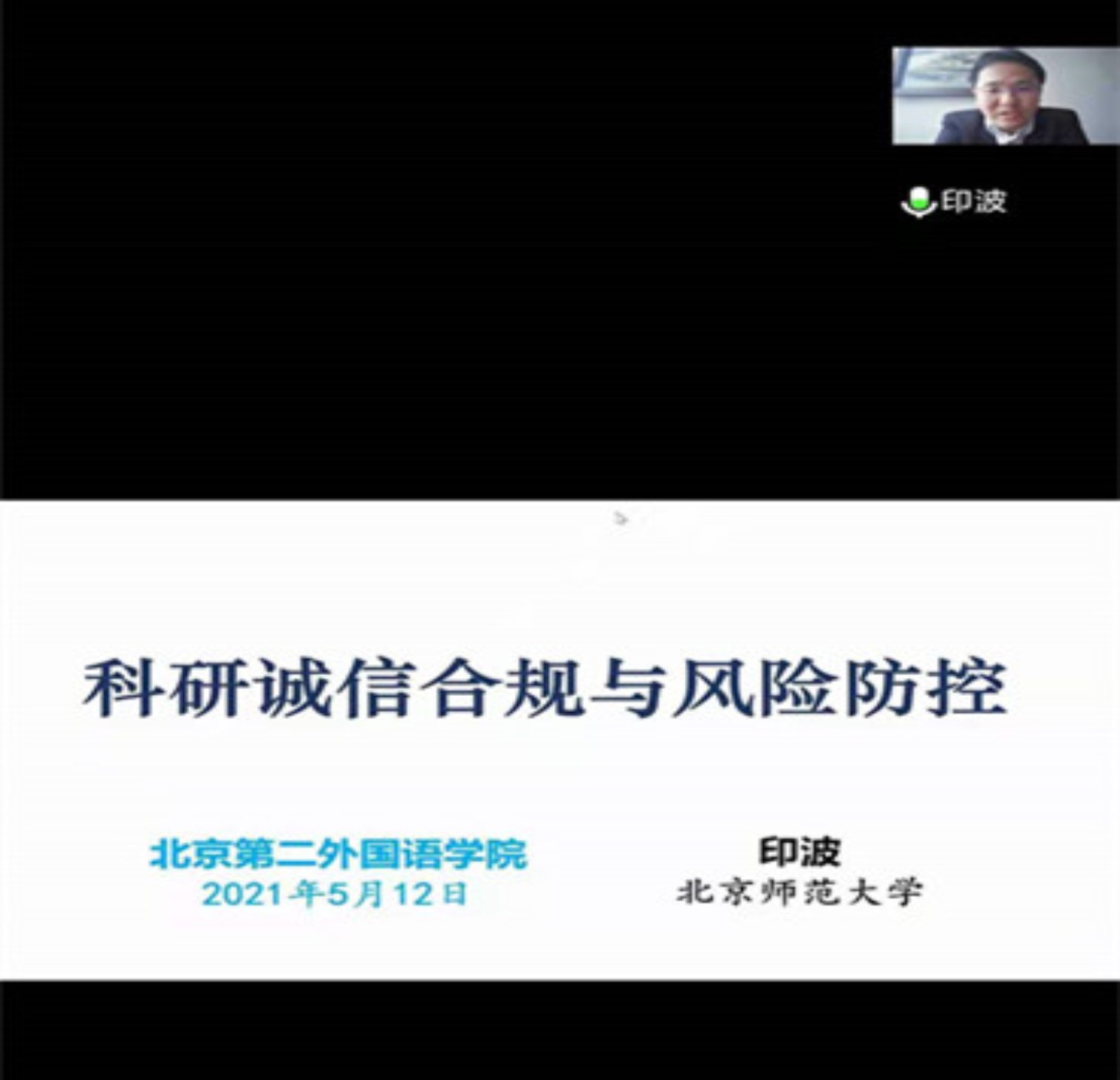 2021年5月12日下午,欧洲杯 学术委员会顾问,欧洲杯 副教授印波应北京第二外国语学院之邀,通过腾讯会议,为该校师生作了题为“科研诚信合规与风险防控”的学术诚信专题培训。培训讲座近300人参加。