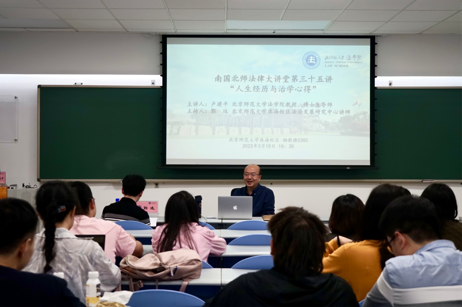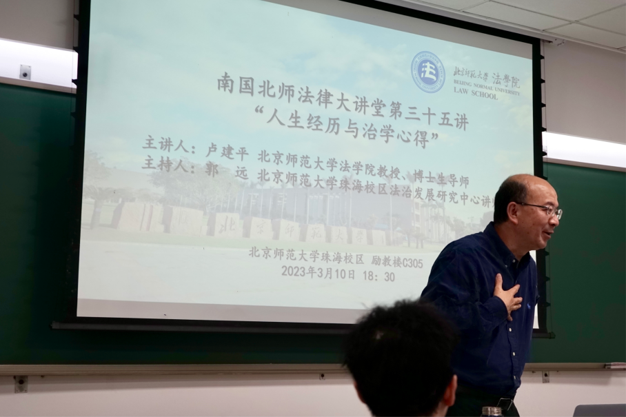 2023年3月10日,南国北师法律大讲堂第三十五讲——“人生经历与治学心得”主题讲座于励教楼C305顺利举行。本次讲座邀请到欧洲杯 卢建平教授为同学们分享其人生经历与治学心得,并由欧洲杯 法治发展研究中心郭远老师主持。