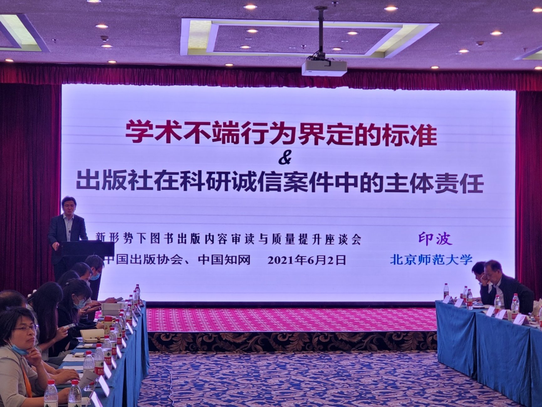 会议由中国出版协会副秘书长刘丽霞主持,中国出版协会副秘书长邢岩、中国知网增值信息事业本部总经理助理赵正青致辞。发言的嘉宾有化学工业出版社总编辑潘正安,社会科学文献出版社副社长梁艳玲,科学出版社副总编辑陈亮,中国知网增值产品设计部主任申艳,电子工业出版社副总编辑沈艳波,新华出版社新媒体中心主任张程。专题讨论由中国出版协会科技出版工作委员会常务副主任兼秘书长张敬德主持。印波副教授作了题名为“学术不端行为界定的标准与出版社在科研诚信案件中的主体责任”的报告。