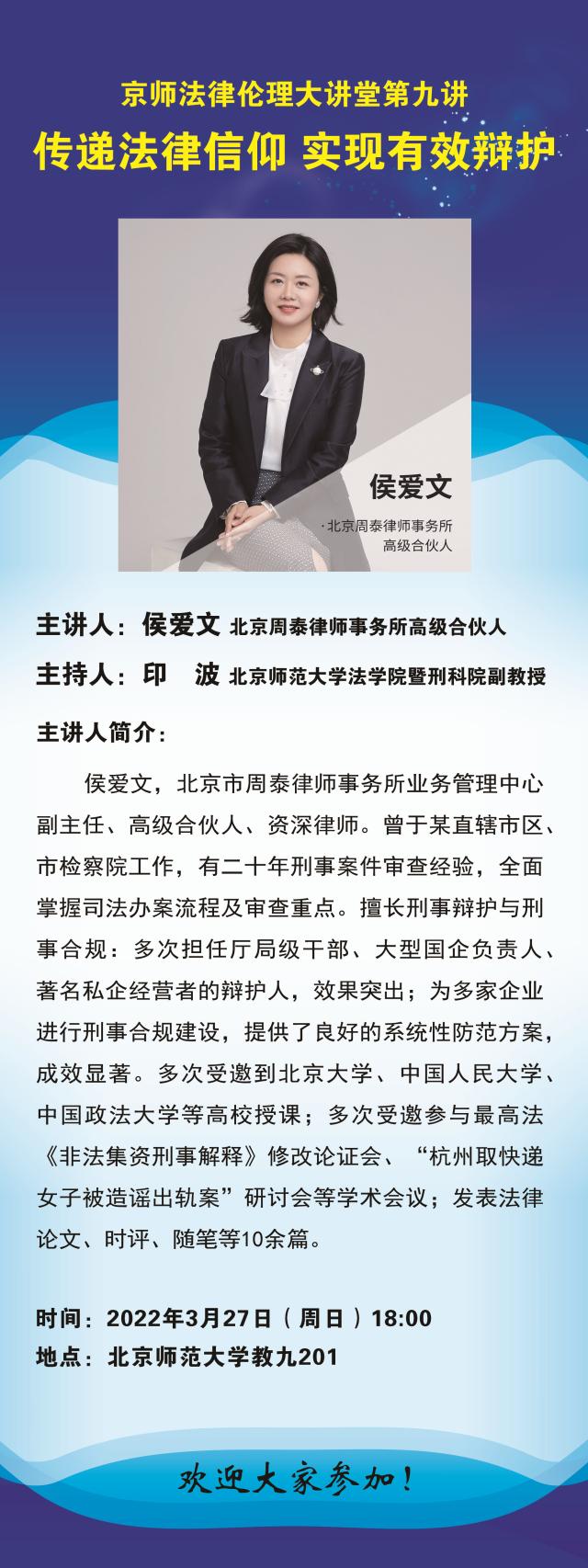【03.27】京师法律伦理大讲堂第九讲:传递法律信仰 实现有效辩护/主讲人:侯爱文