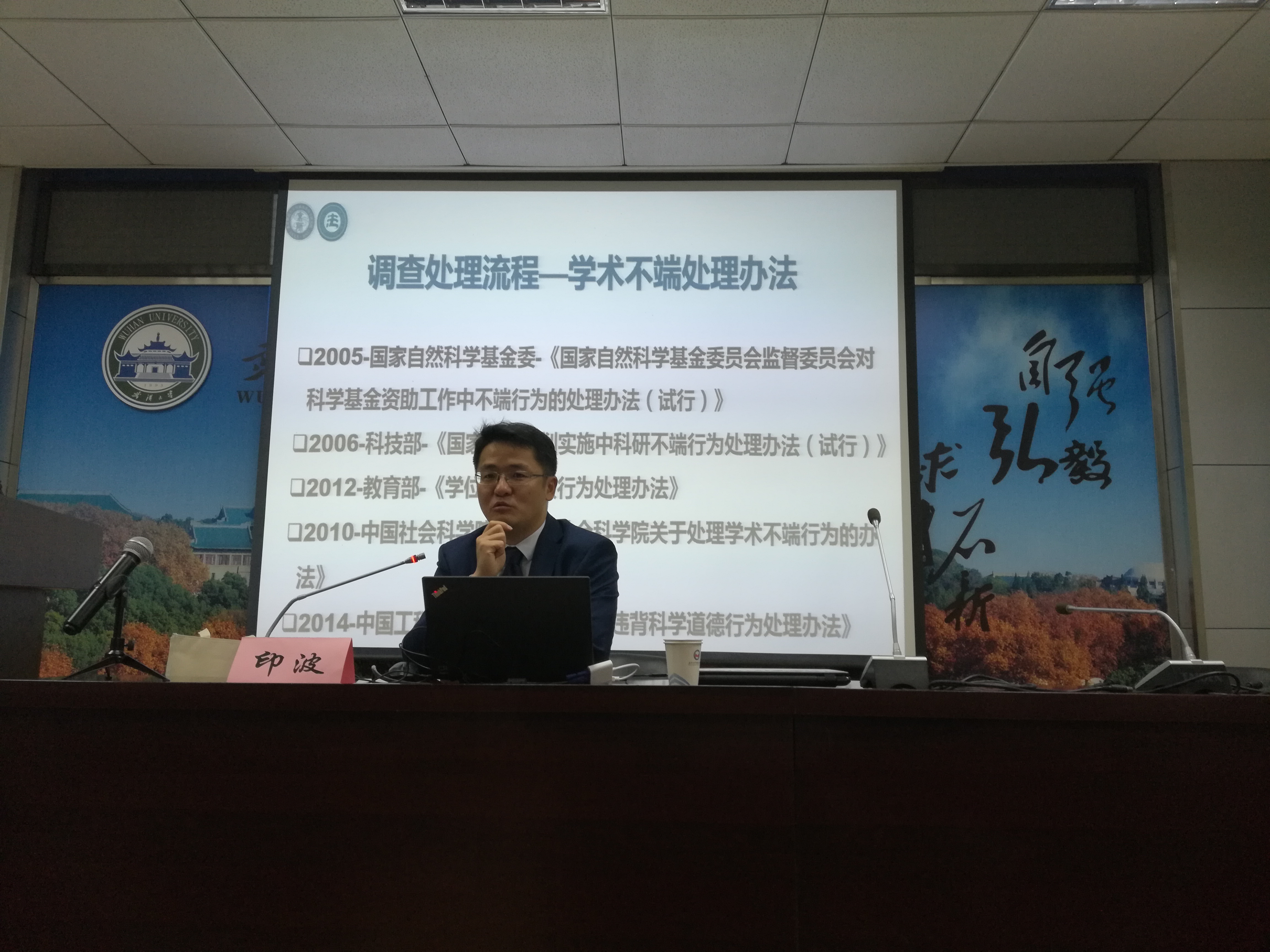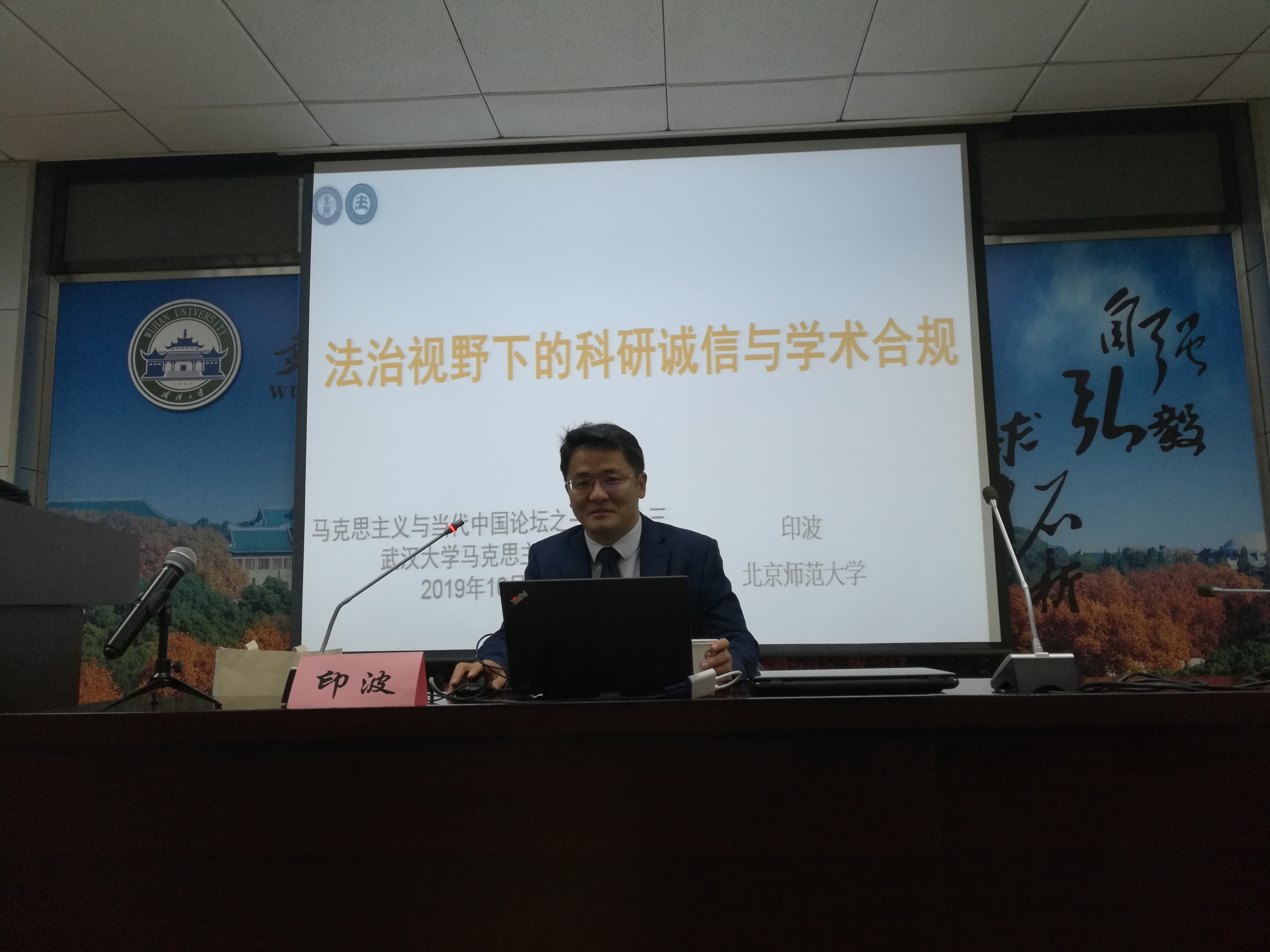 2019年10月26日上午,武汉大学马克思主义学院第113期“马克思主义与当代中国”论坛在马克思主义学院M301会议室举行。本次学术讲座以“法治视野下的科研诚信与学术合规”为主题,由欧洲杯 学术委员会顾问,我院印波副教授主讲,由武汉大学马克思主义学院杨礼银副院长主持,相关专业硕博研究生参加了讲座。
