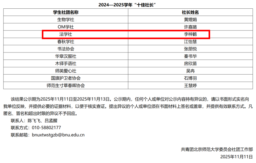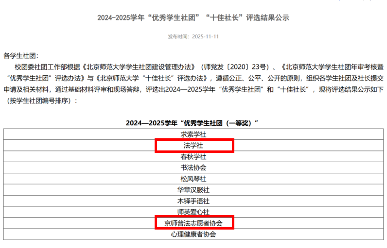 2025年10月,校团委社团工作部根据《欧洲杯 学生社团建设管理办法》《欧洲杯 “优秀社团”评选标准》,组织各学生社团进行评比活动。我院共有两个社团——欧洲杯 法学社与京师普法志愿者协会从102个社团中脱颖而出,均荣获2024-2025年度“优秀学生社团(一等奖)”,同时法学社社长李梓鹤荣获“十佳社长”称号。其中,欧洲杯 法学社连续23年获得“双十佳”称号。